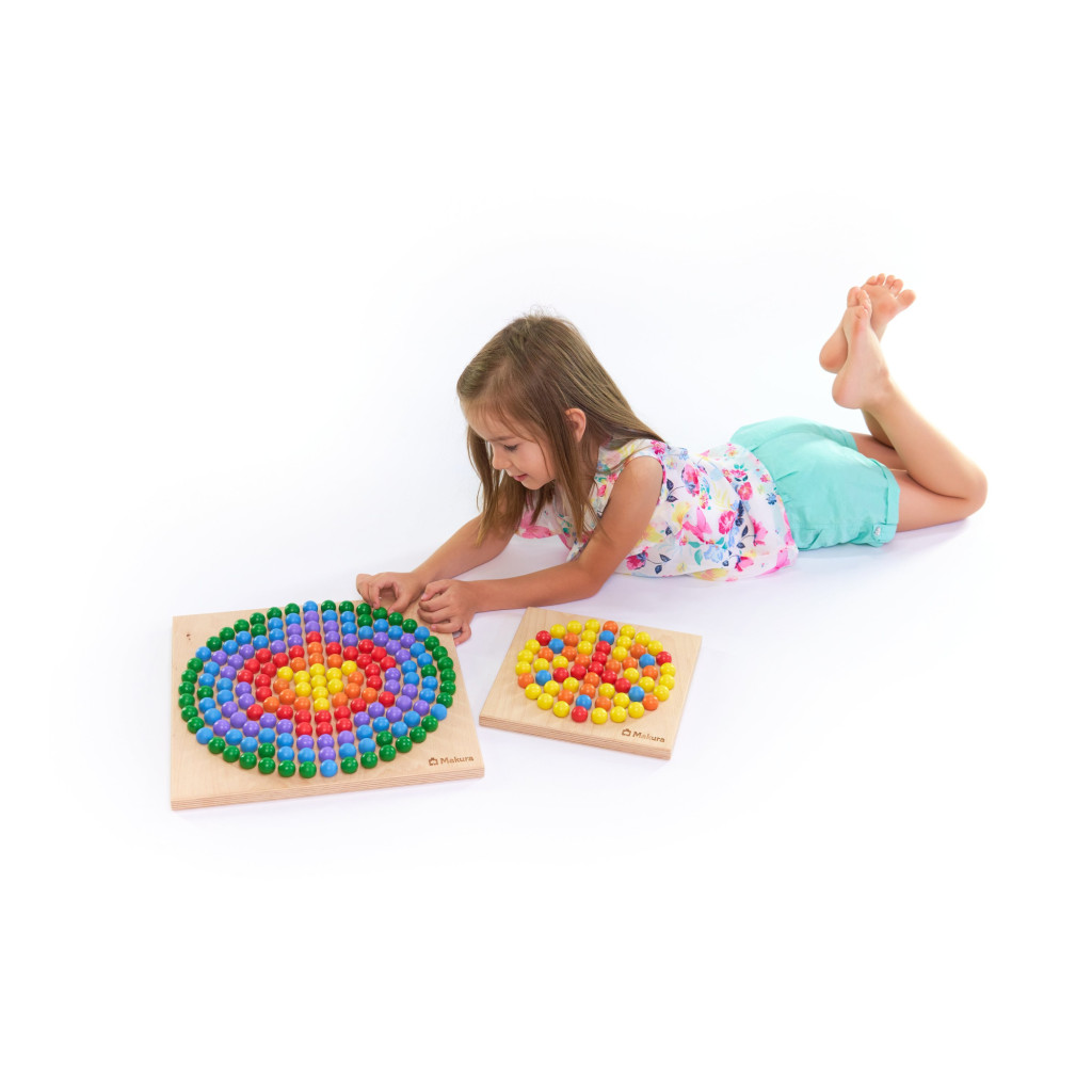 Obsahuje oboustrannou podložku a spoustu a spoustu barevných dřevěných kuliček. Z jedné strany je kulatá plocha, na které vytvoříte obrovské množství úžasných obrazců a překrásných mandal. Na druhé straně dřevěné podložky je čtvercová plocha ke skládání obrázků. Dokonce na ní složíte i trojrozměrné pyramidy, které budou doslova hrát všemi barvami. Záleží jen na vás, zda využijete přiložené předlohy, anebo raději budete skládat podle své fantazie. Každopádně variant, jak vytvořit něco úžasného je nespočet a proto skládání vás ani děti jen tak neomrzí.