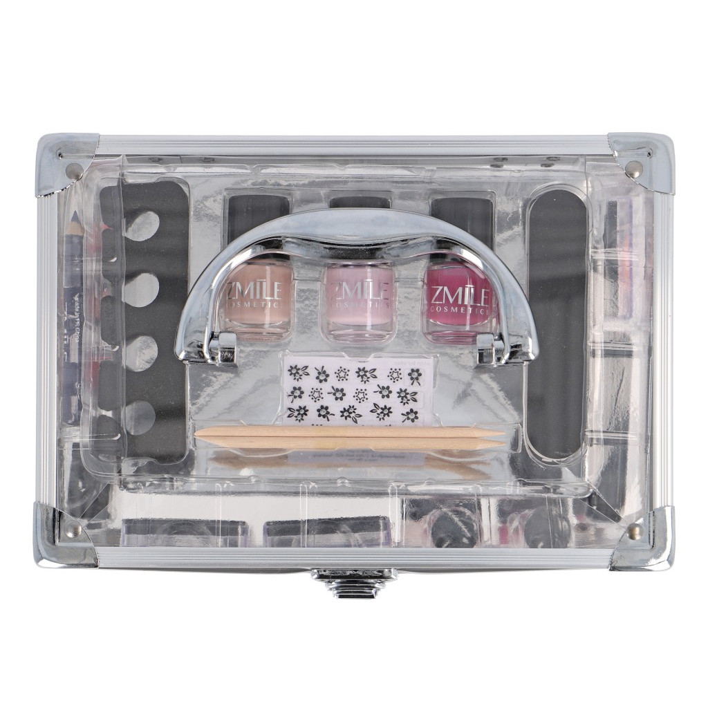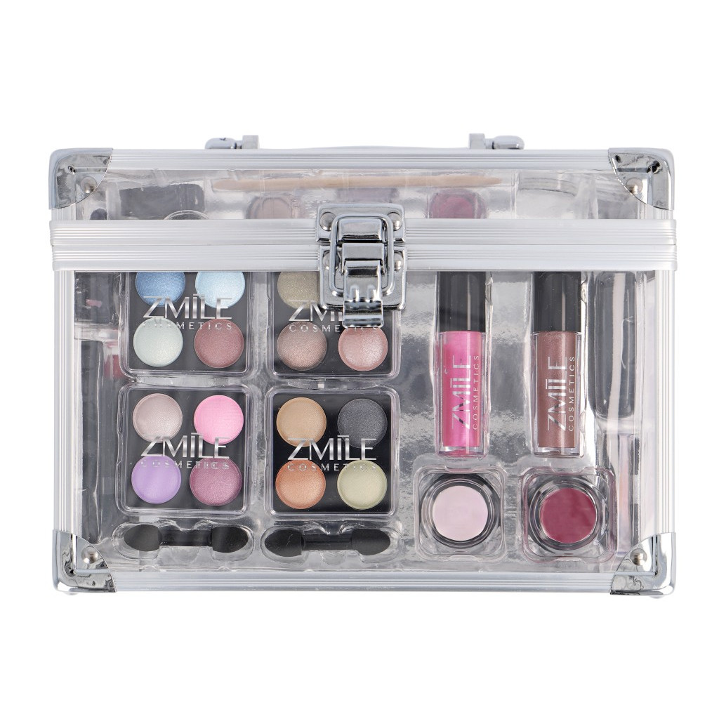 Kosmetický kufřík plastový průhledný Acrylic – celkem 42 ks příslušenství. Obsahuje 16× očními stíny ,2× tvářenku, 1× pudr, 3× rtěnku, 1× tužku na oči, 2× lesk na rty, 2× krémový lesk na rty, 3× lak na nehty,1× separátor na nehty, aršíl s nálepkami na nehty, 2× polník na nehty, 2× aplikátor,1× ořezávátko, 1× štětec na tvářenku, 1× kapesní zrcátko a 1×1× vyjmutelný box se zrcátkem se stíny a tvářenkou. Dermatologicky testováno, vyhovuje přísným normám EU.
